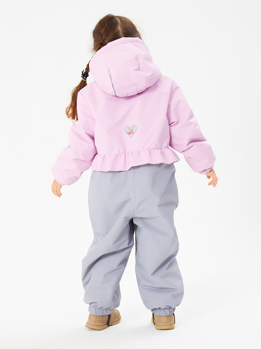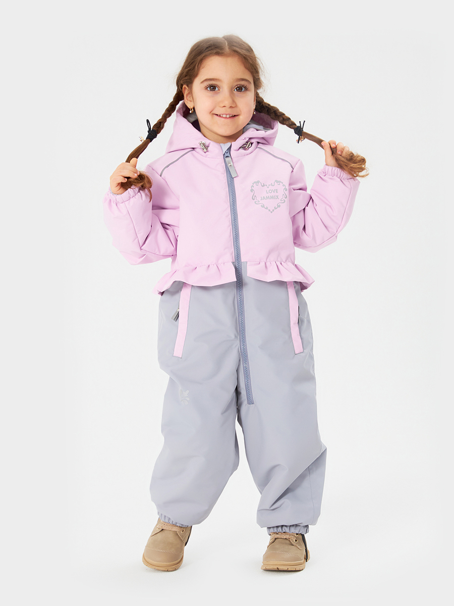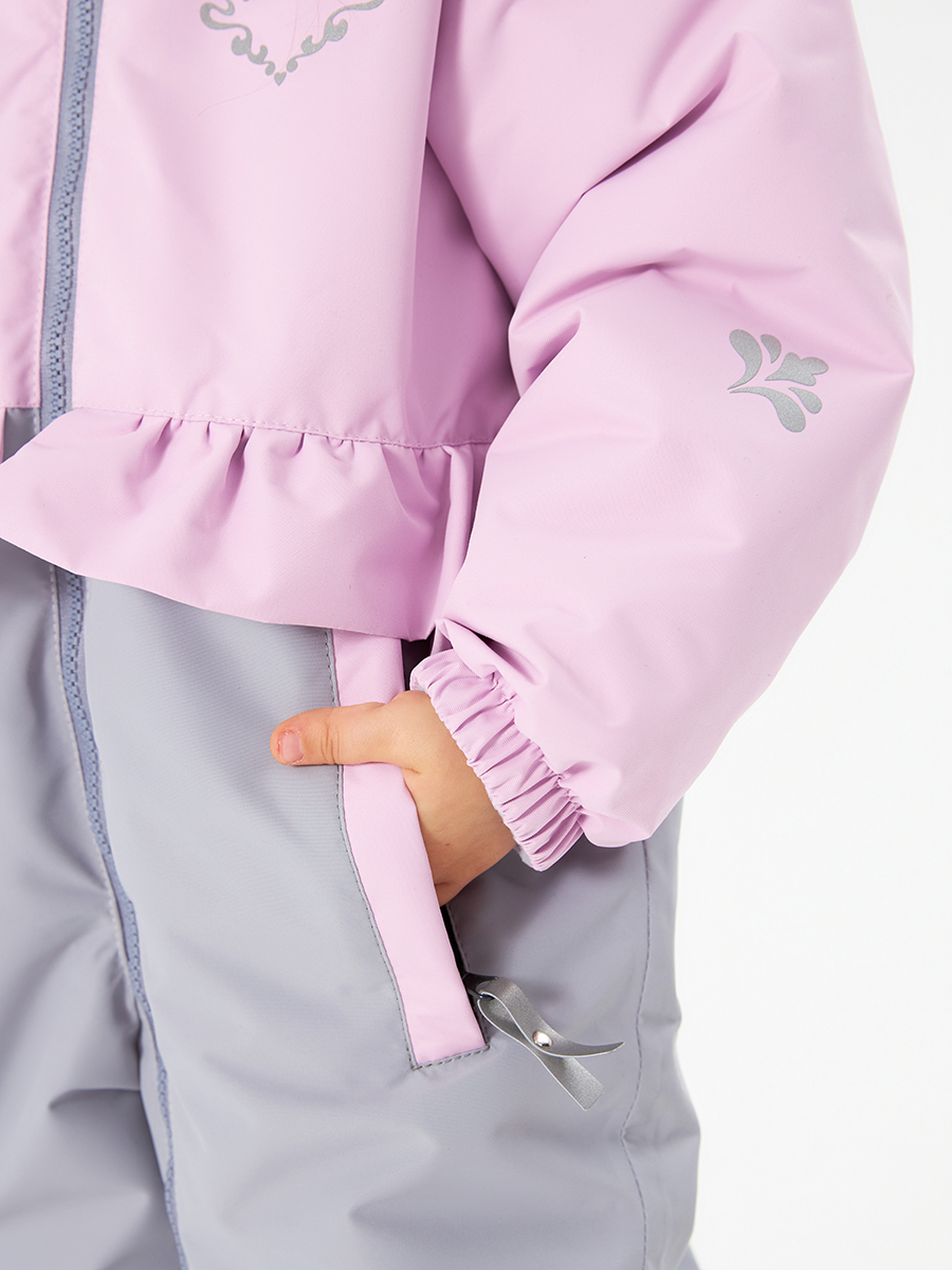Демисезонный комбинезон для девочки с декоративной рюшей и светоотражающими наклейками.