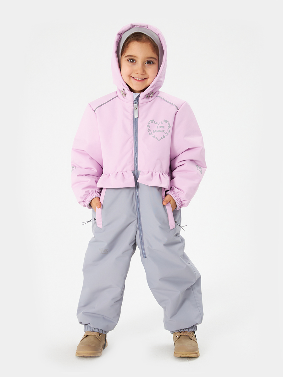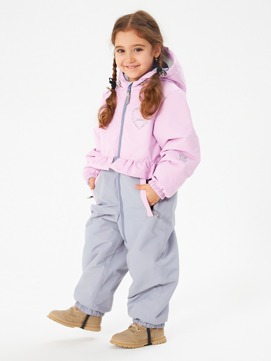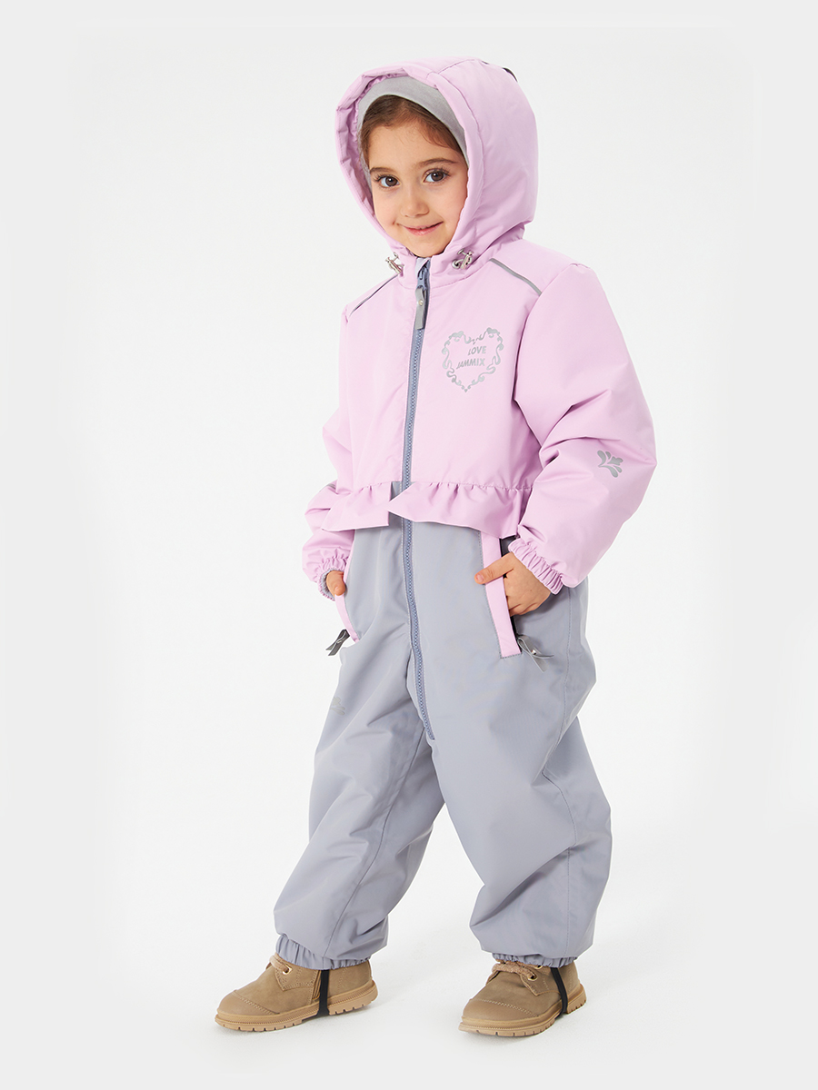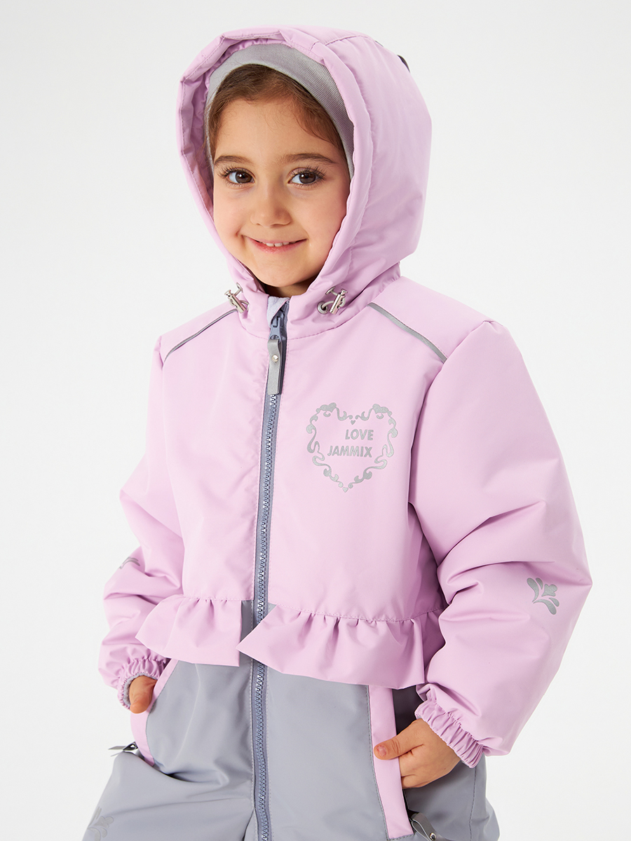 Демисезонный комбинезон для девочки с декоративной рюшей и светоотражающими наклейками.