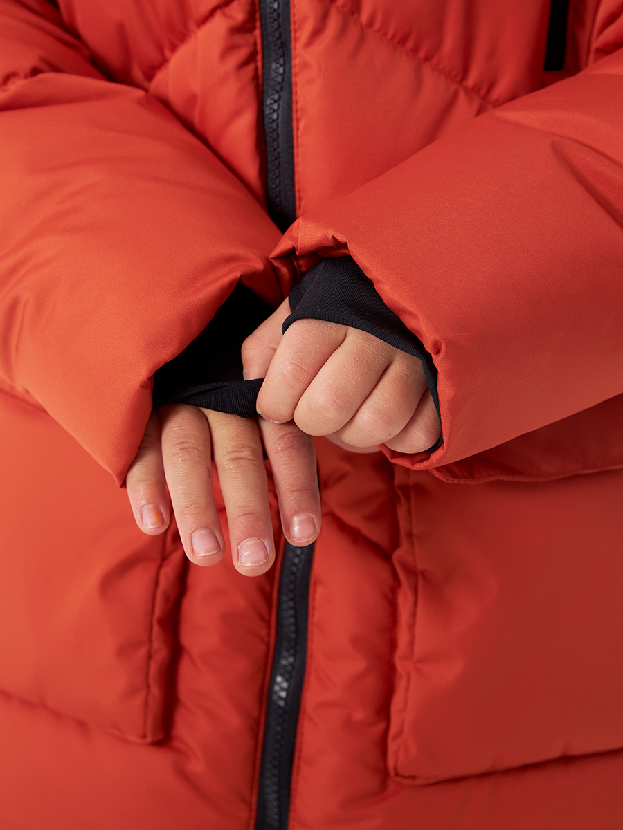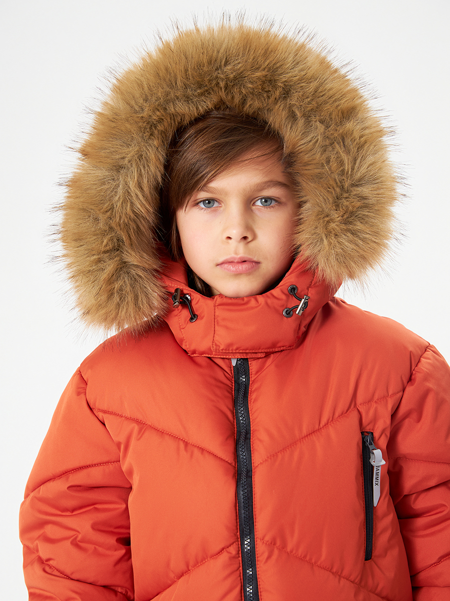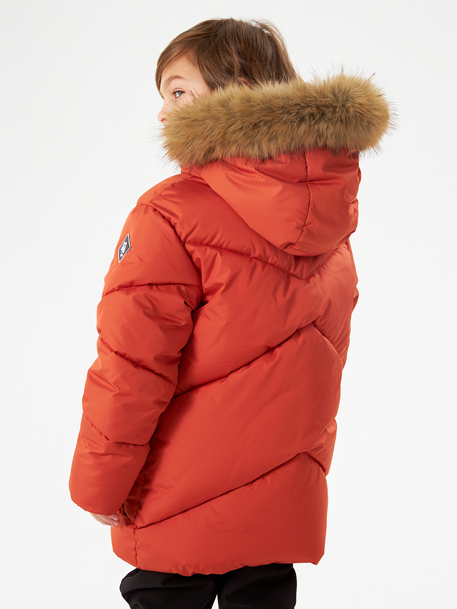 Застежка молния с внутренней планкой. Декоративные светоотражающие элементы добавляют пуховику элегантности и безопасности в темное время суток. Съемная опушка из искусственного меха надежно защищает от ветра и снега.